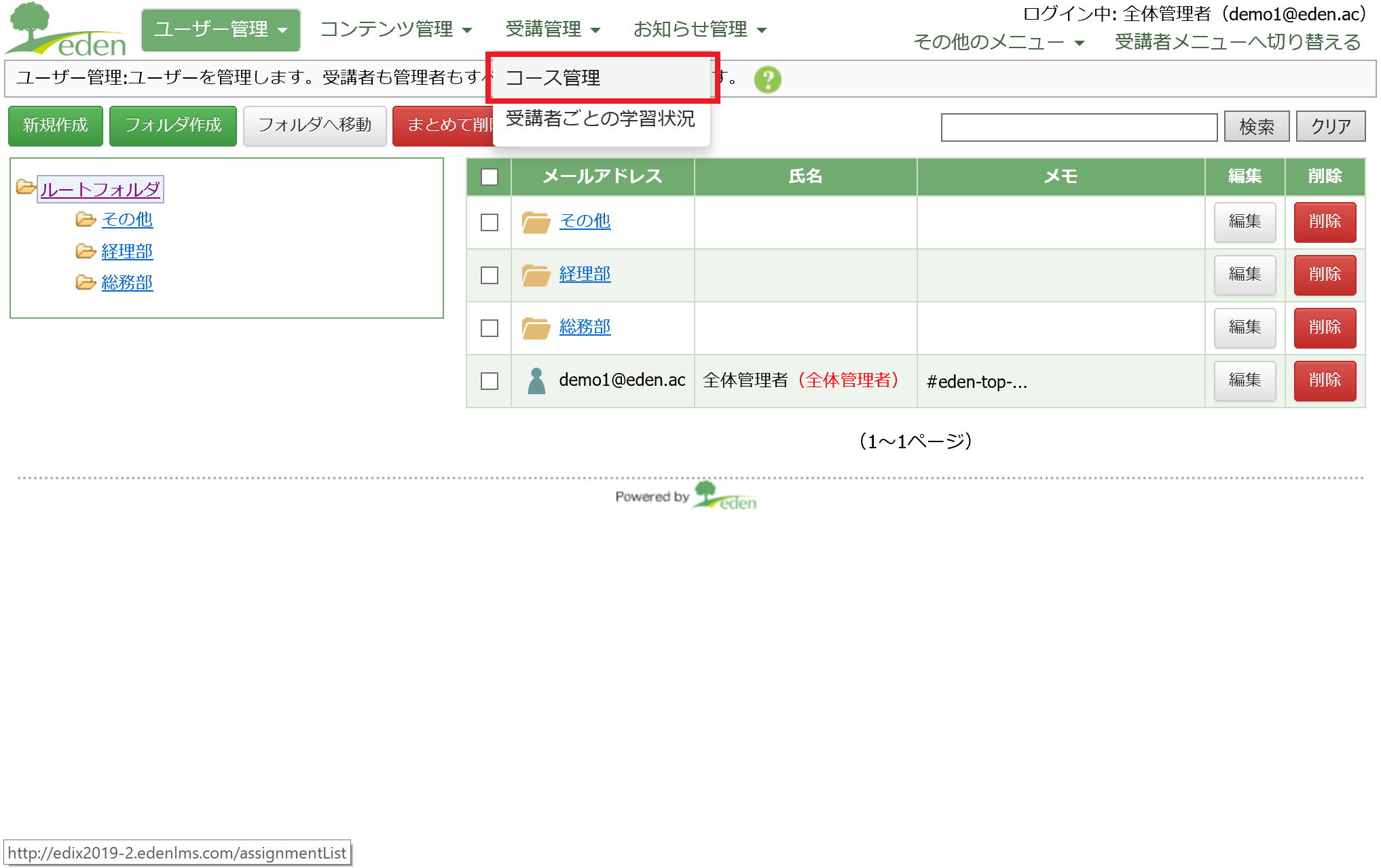 管理画面メニューの「受講管理」にマウスオーバーをすると表示される「コース管理」をクリックします。