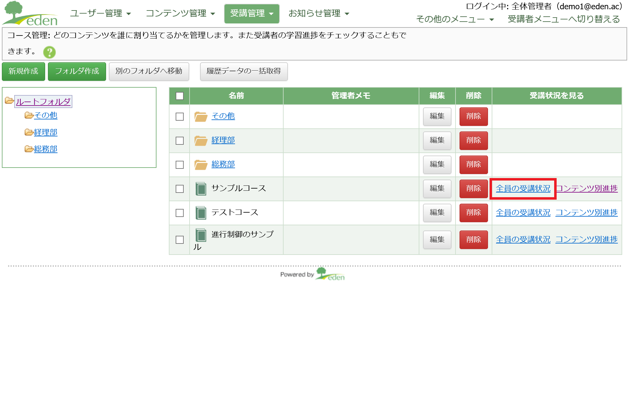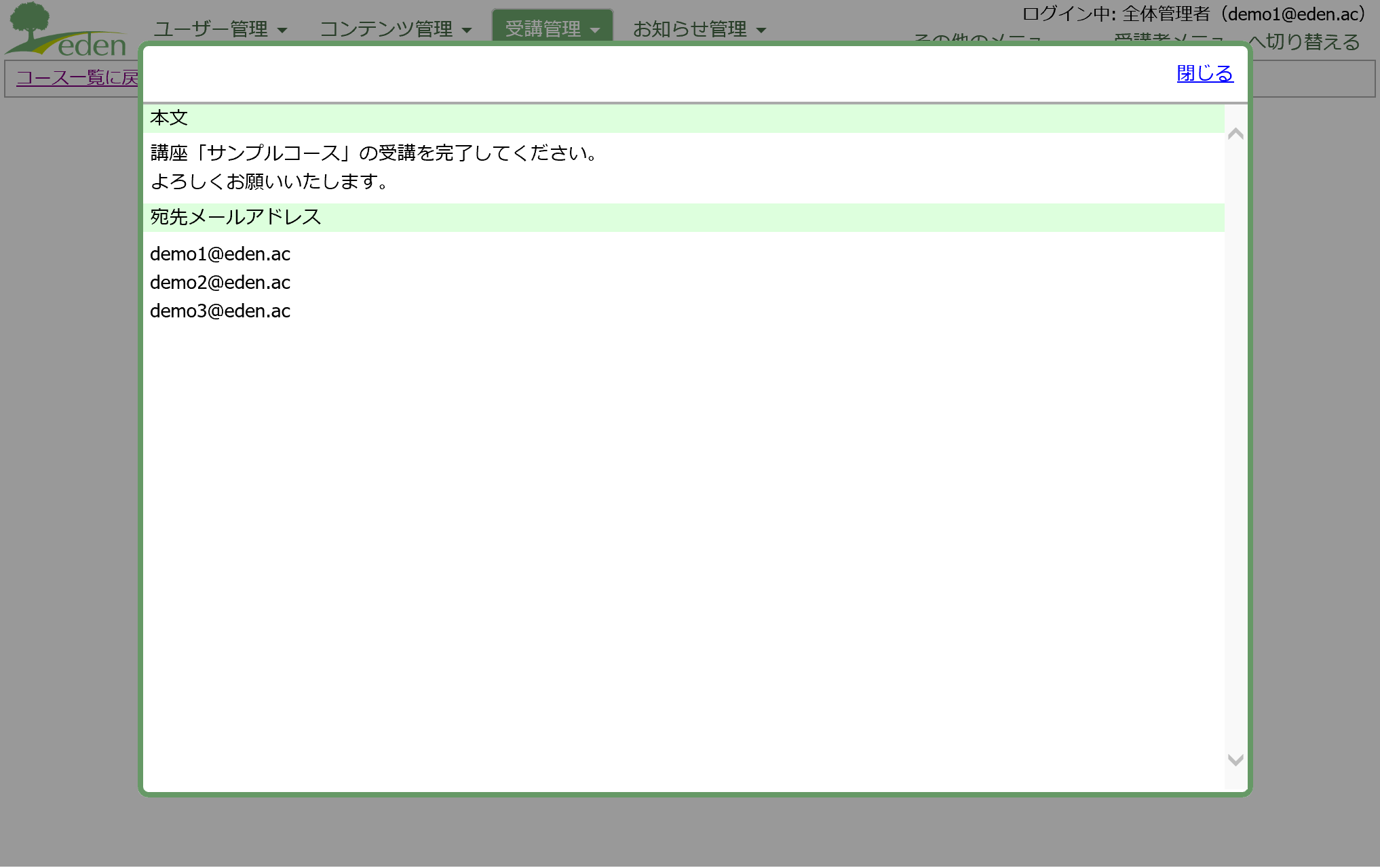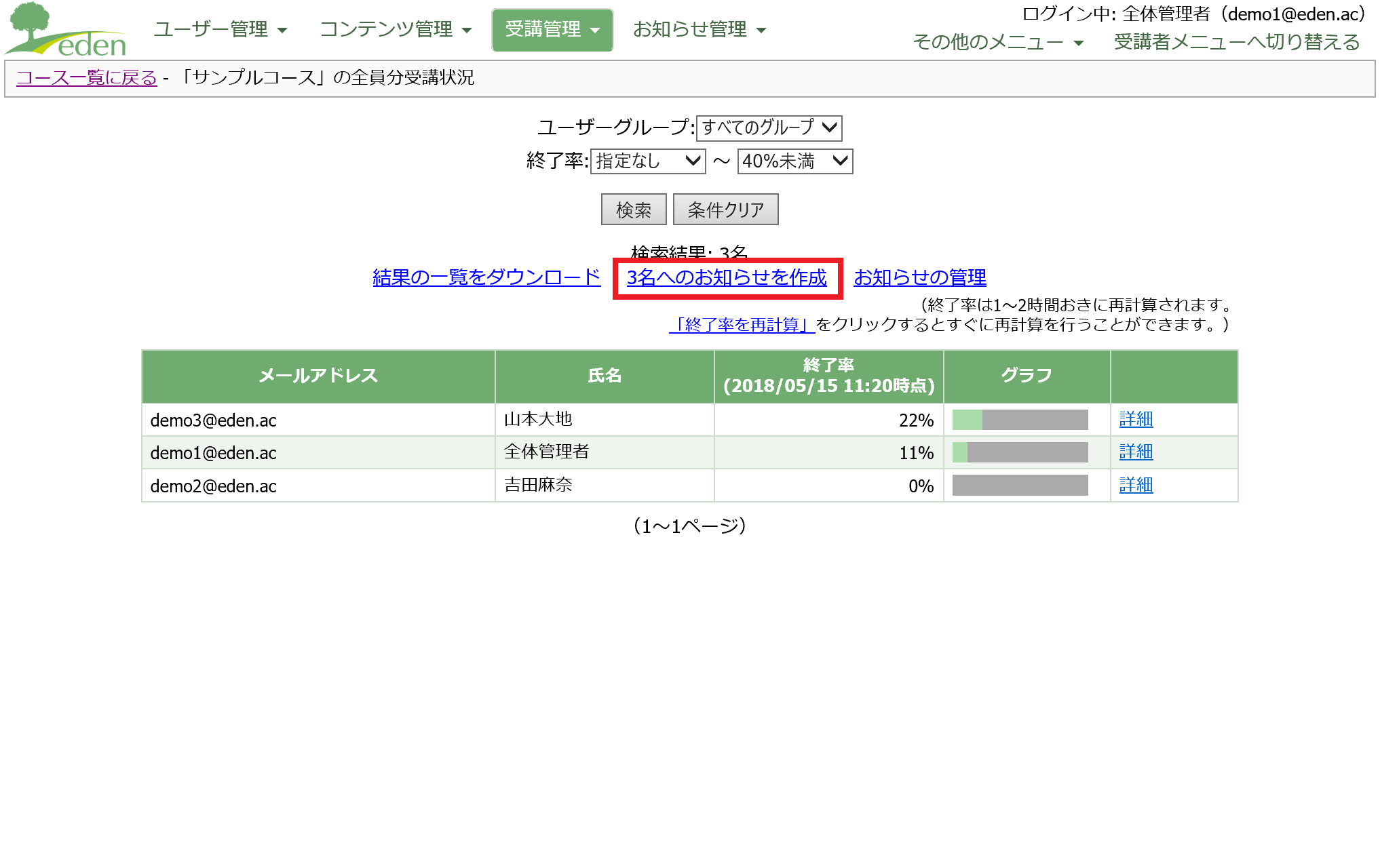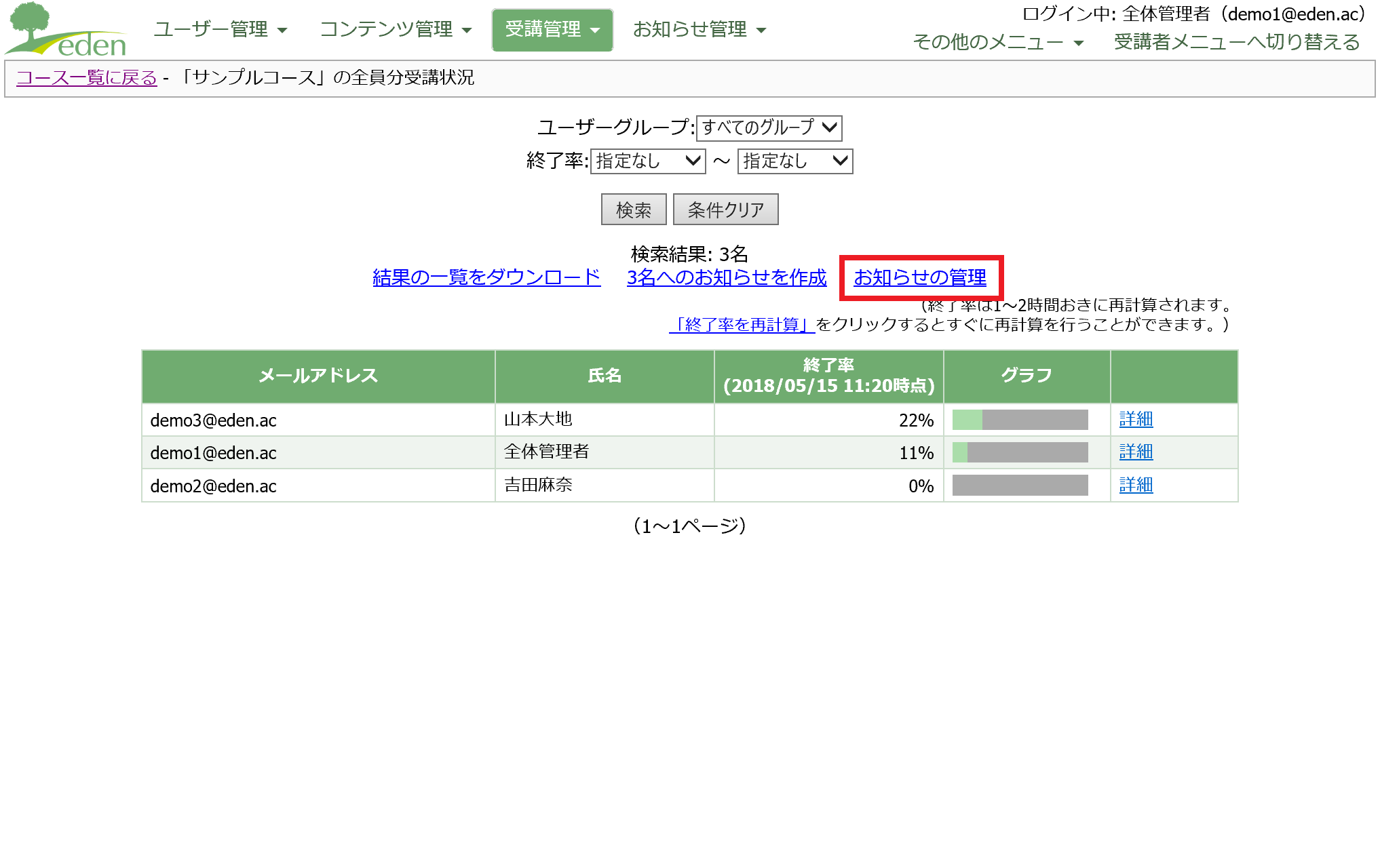 また、送ったお知らせの履歴については「全員分受講状況」画面の「お知らせの管理」から確認できます。