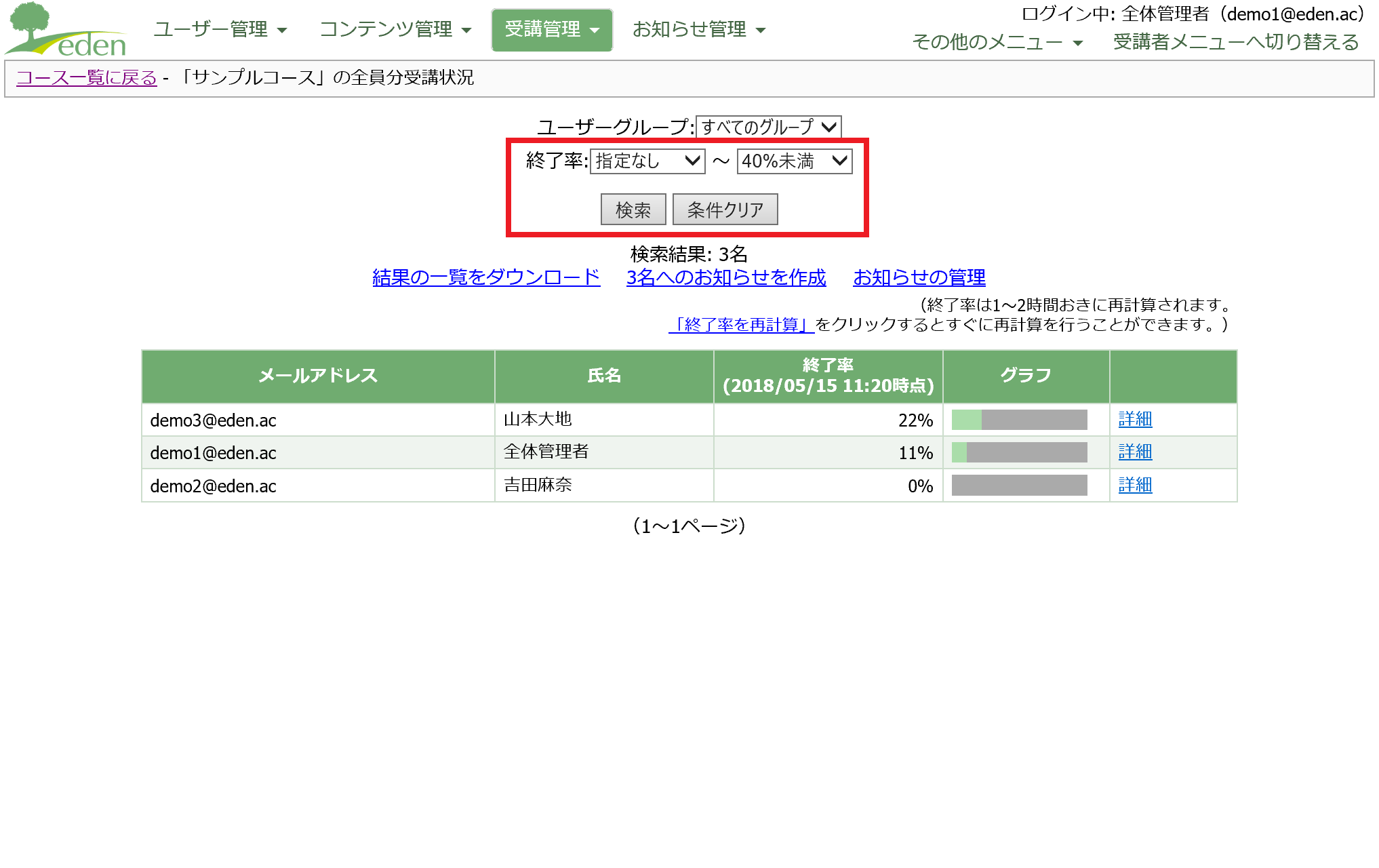 確認したい進行状況の条件を入力します。たとえば、40%未満の受講者に絞りたいときは、「終了率」を「〜40%未満」とし、「検索」ボタンをクリックします。