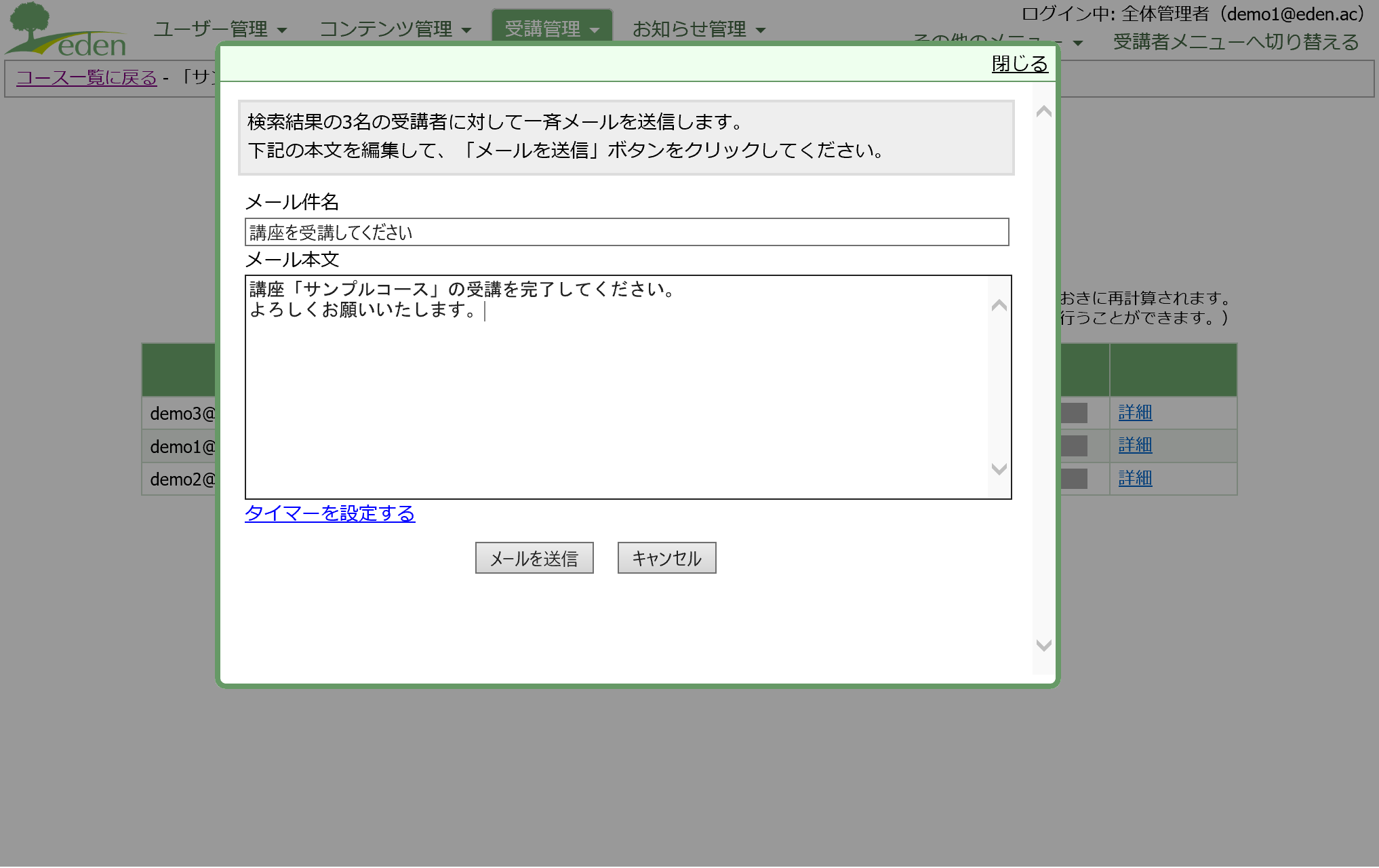 これで検索条件として抽出された受講者にのみ、お知らせのメールが届きます。