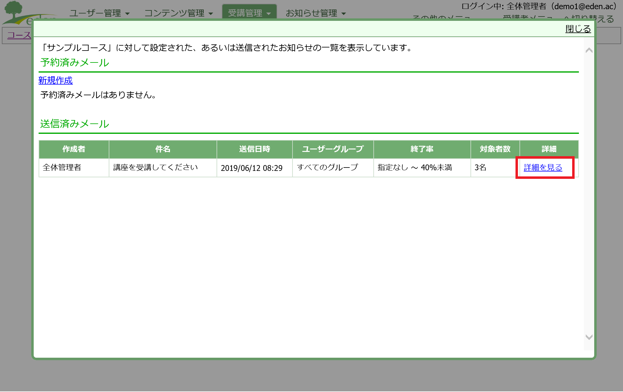 「詳細を見る」をクリックすると、送ったお知らせの文面及び送信した宛先の確認ができます。