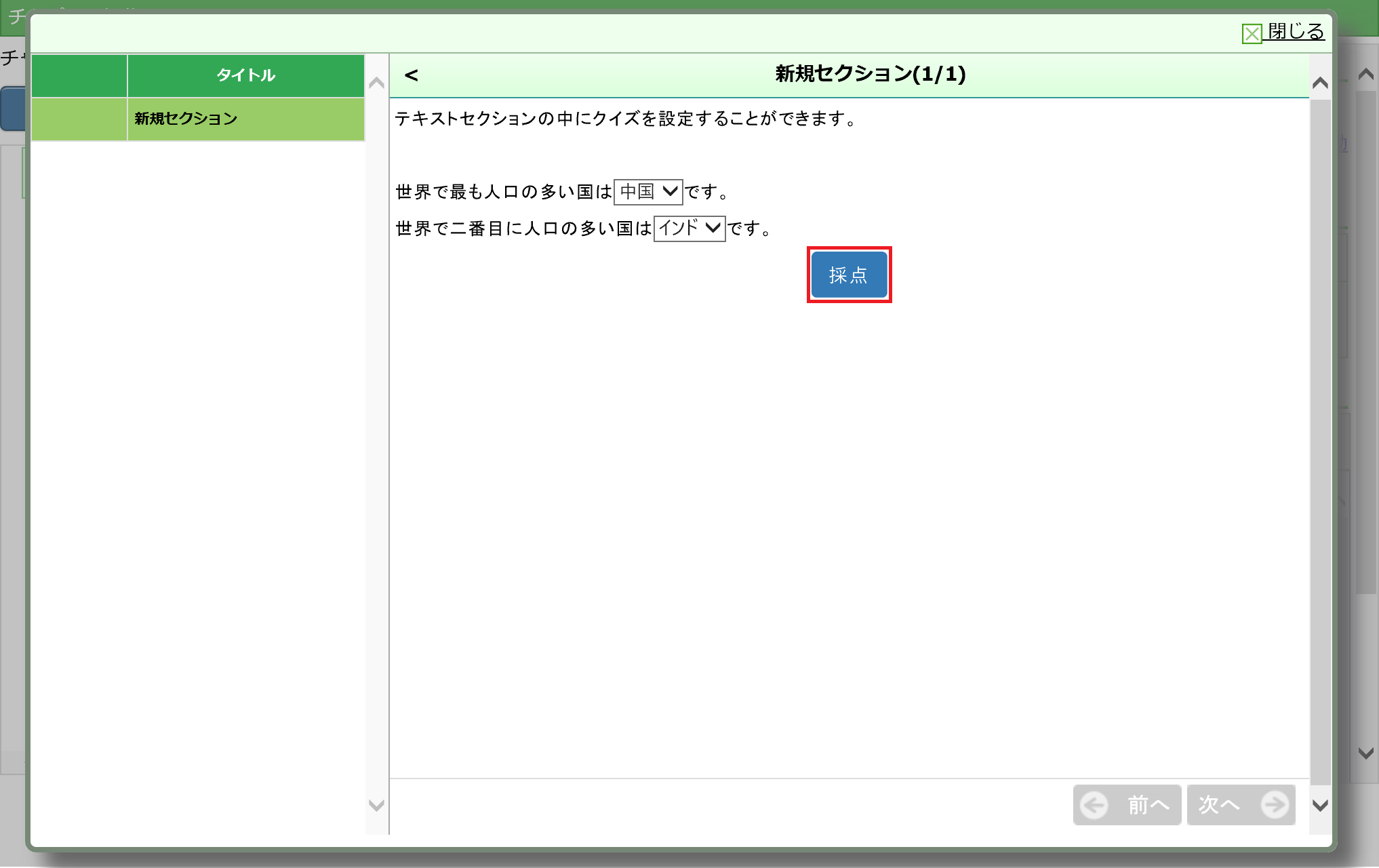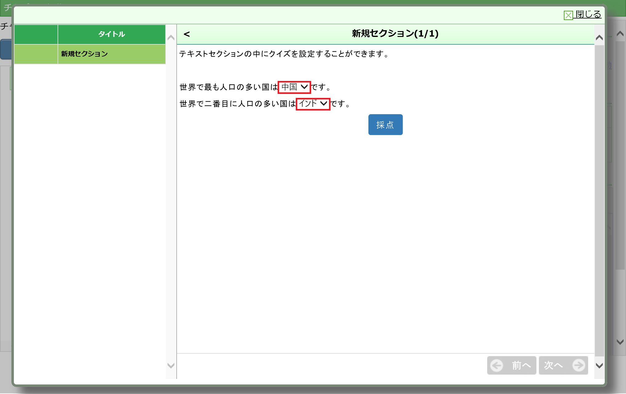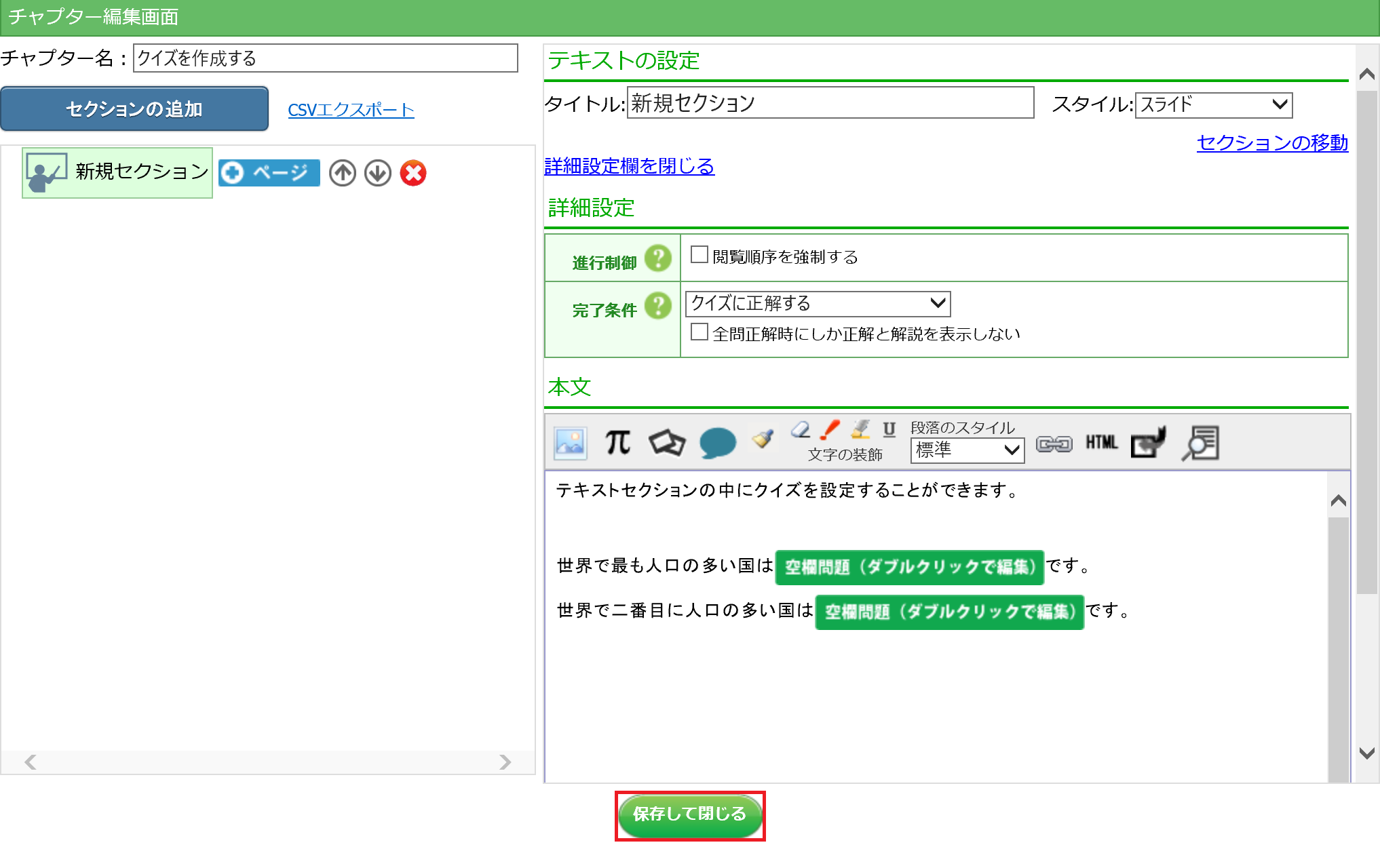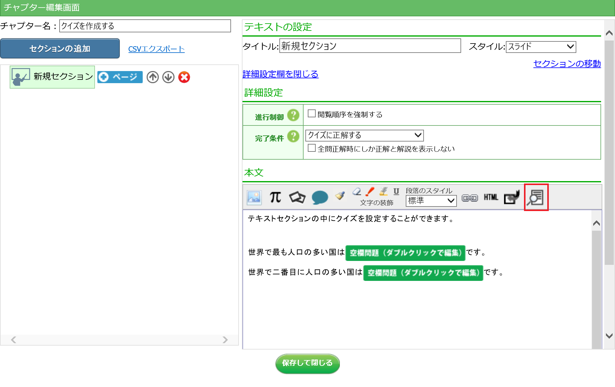 eラーニングシステム「eden LMS」では、読みものあるいは動画や資料などを閲覧する「レッスンセクション」を利用できますが、このページでは「レッスンセクション」で作成した空欄補充問題にクイズを設定する方法について説明します。(「レッスンセクション」そのもの作成については、レッスンを作成するを参照してください。)