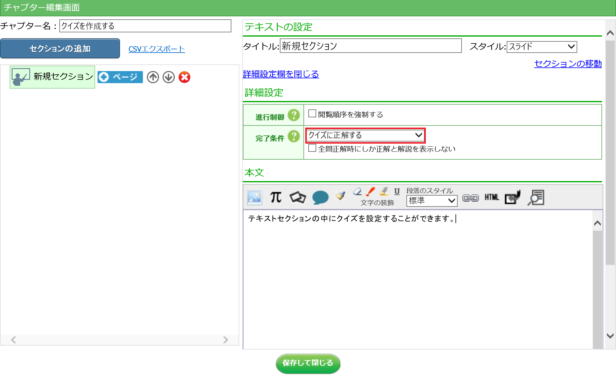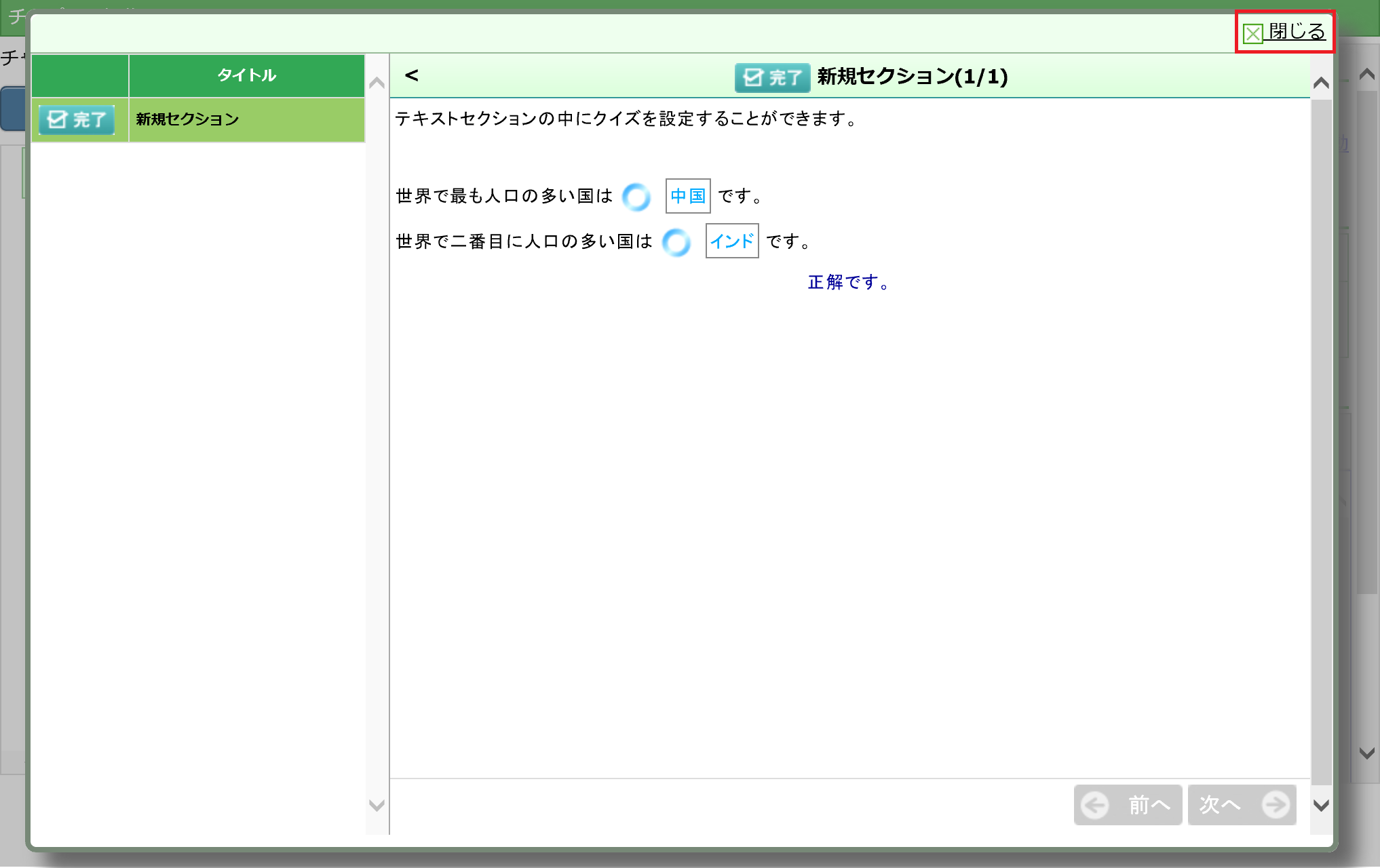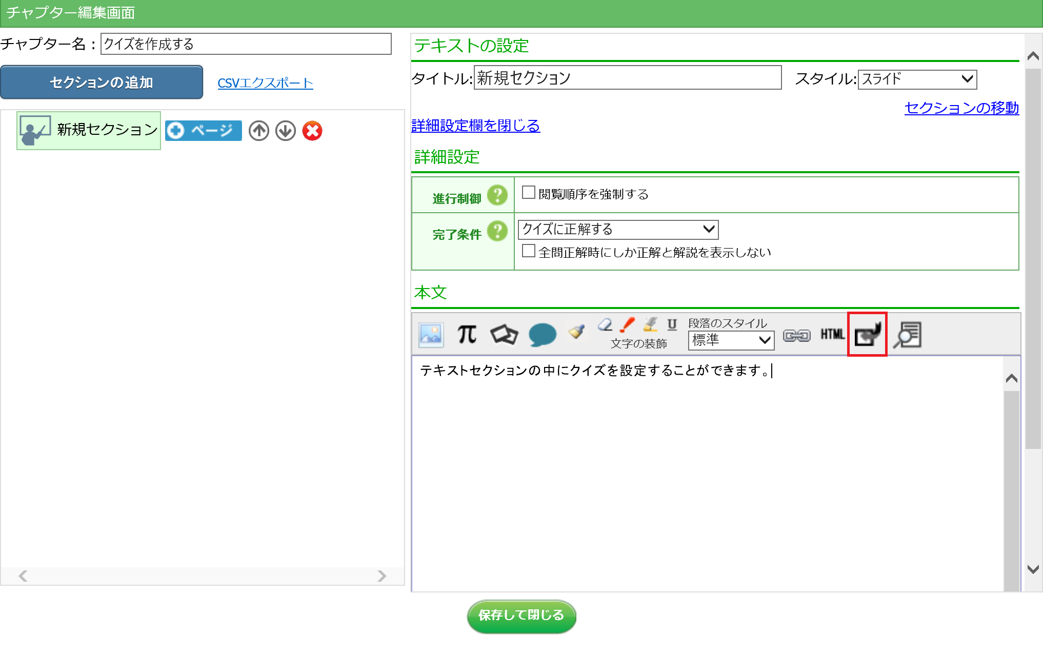 eラーニングシステム「eden LMS」では、読みものあるいは動画や資料などを閲覧する「レッスンセクション」を利用できますが、このページでは「レッスンセクション」で作成した空欄補充問題にクイズを設定する方法について説明します。(「レッスンセクション」そのもの作成については、レッスンを作成するを参照してください。)