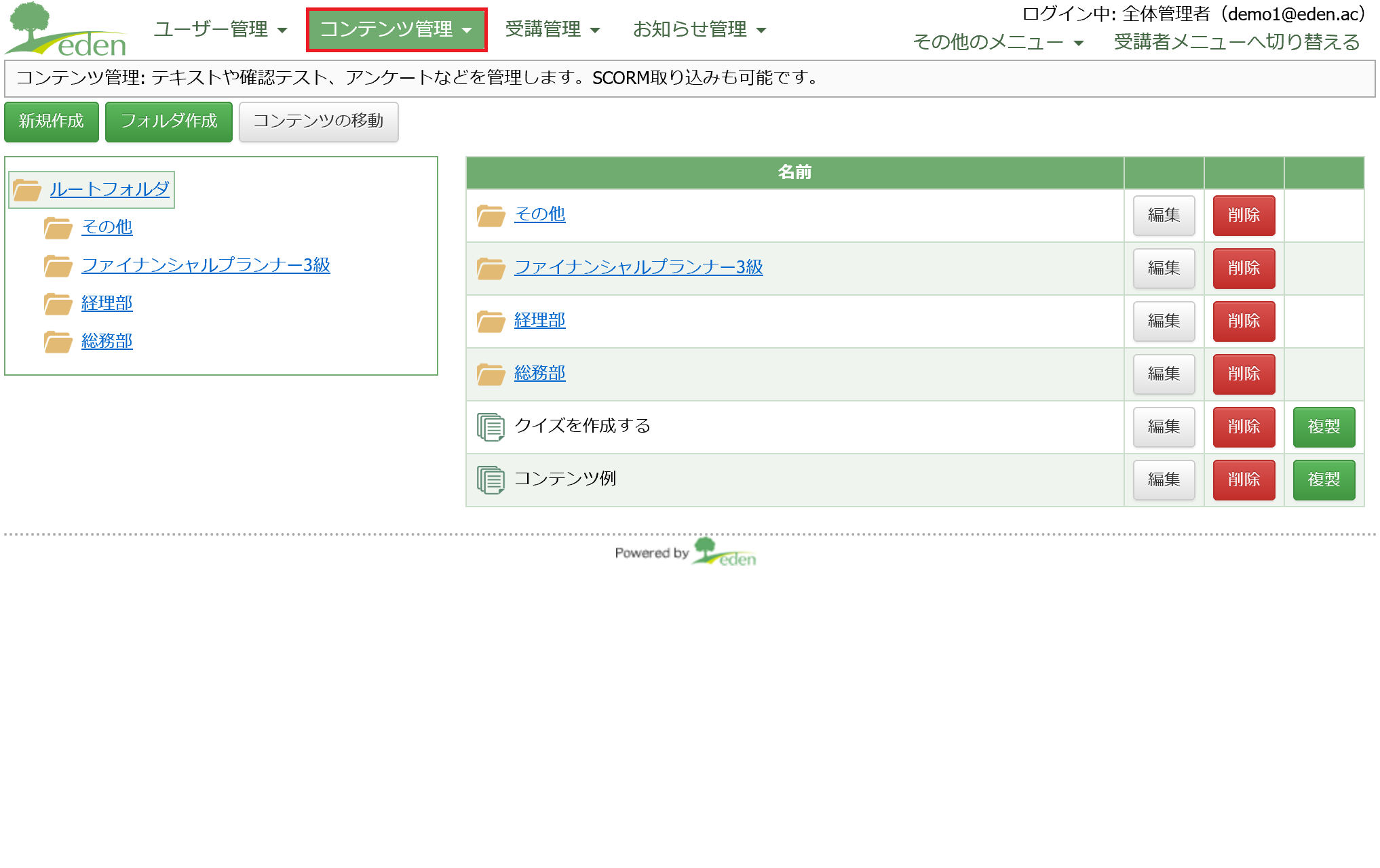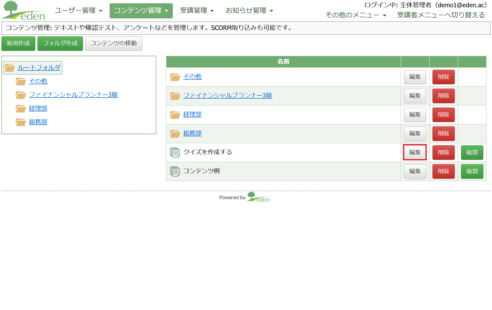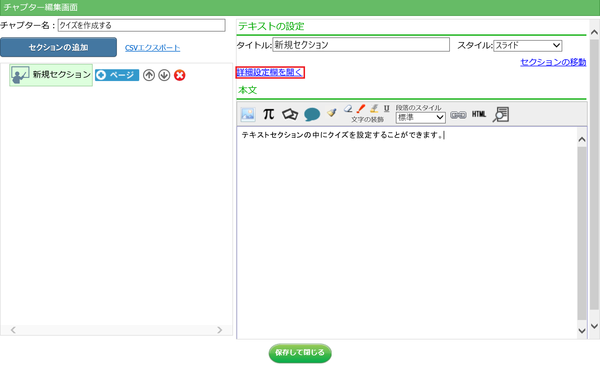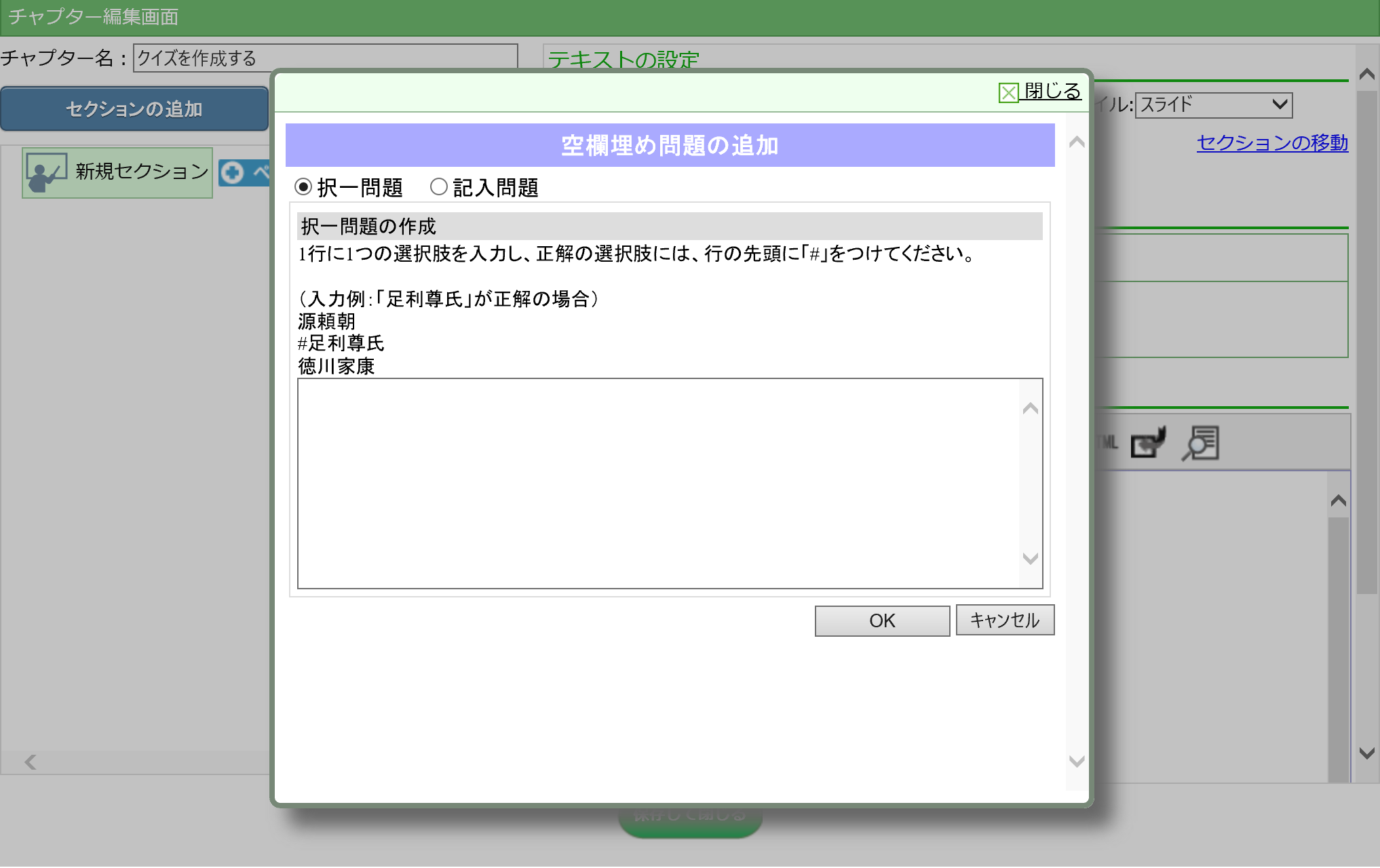 eラーニングシステム「eden LMS」では、読みものあるいは動画や資料などを閲覧する「レッスンセクション」を利用できますが、このページでは「レッスンセクション」で作成した空欄補充問題にクイズを設定する方法について説明します。(「レッスンセクション」そのもの作成については、レッスンを作成するを参照してください。)