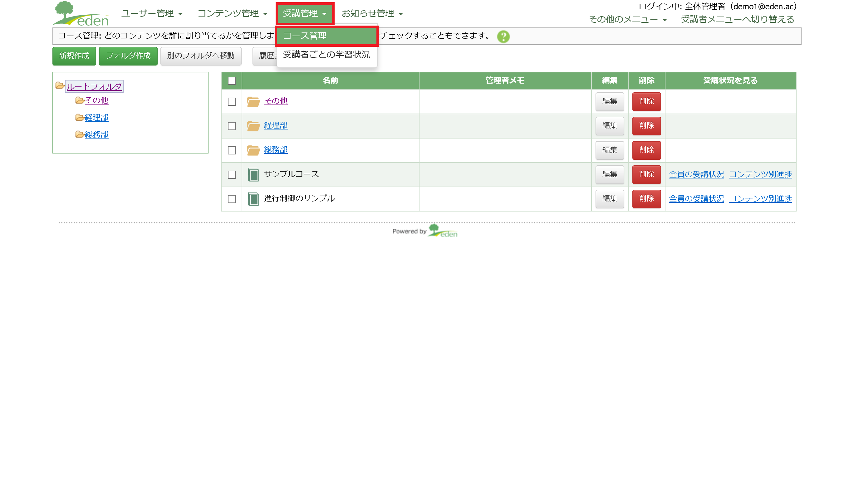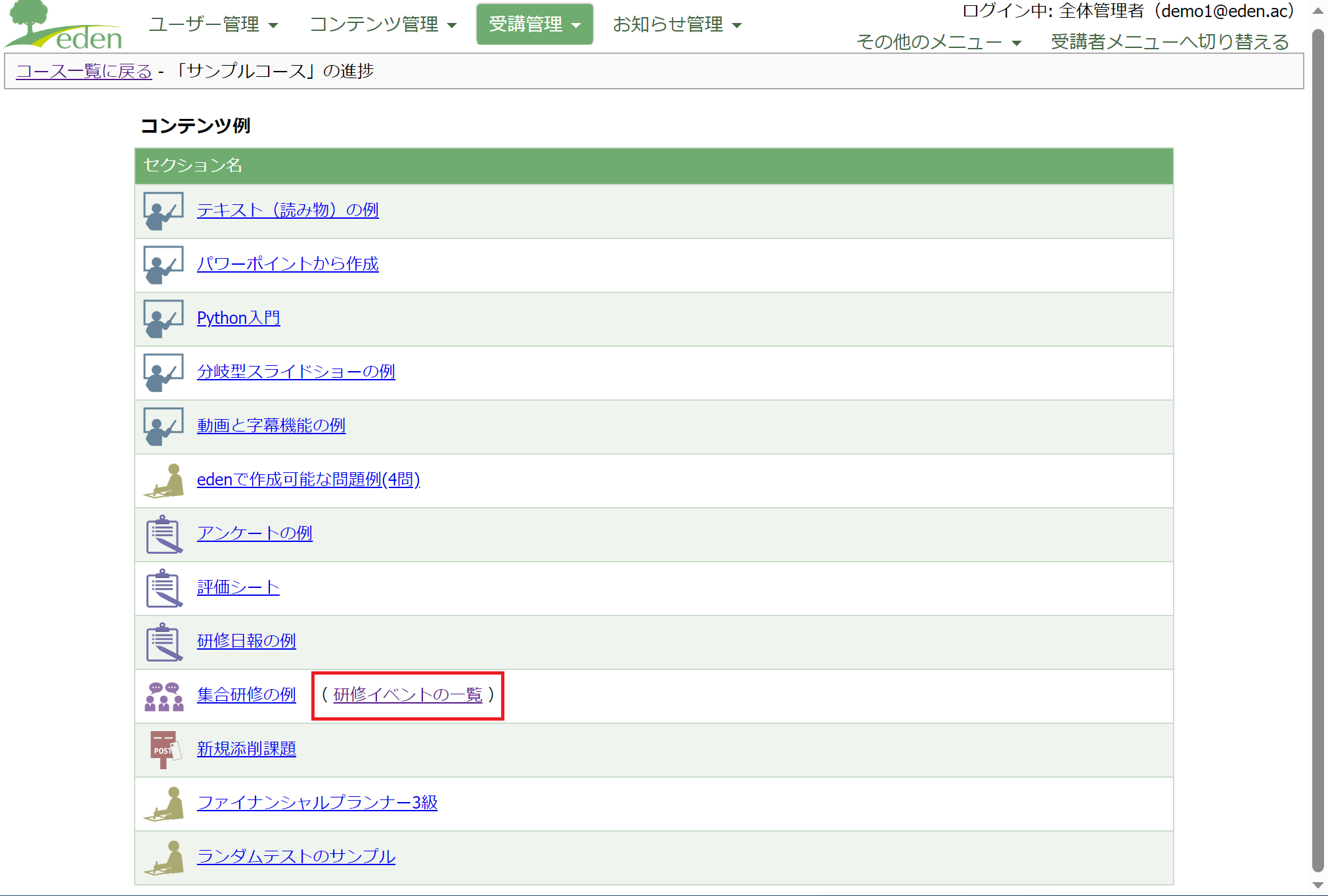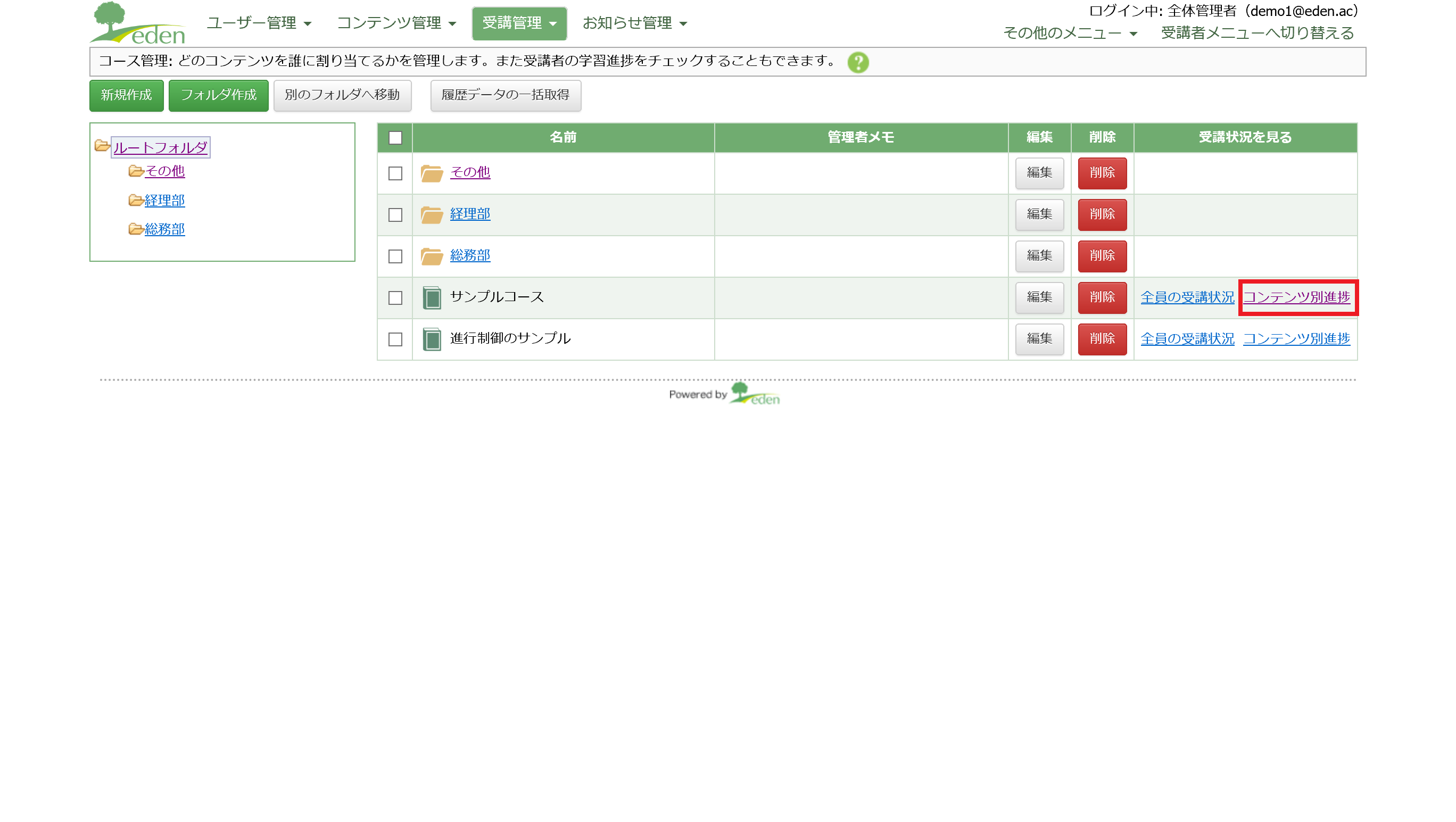 設定したい対面研修を含むコースの「コンテンツ別進捗」をクリックします。