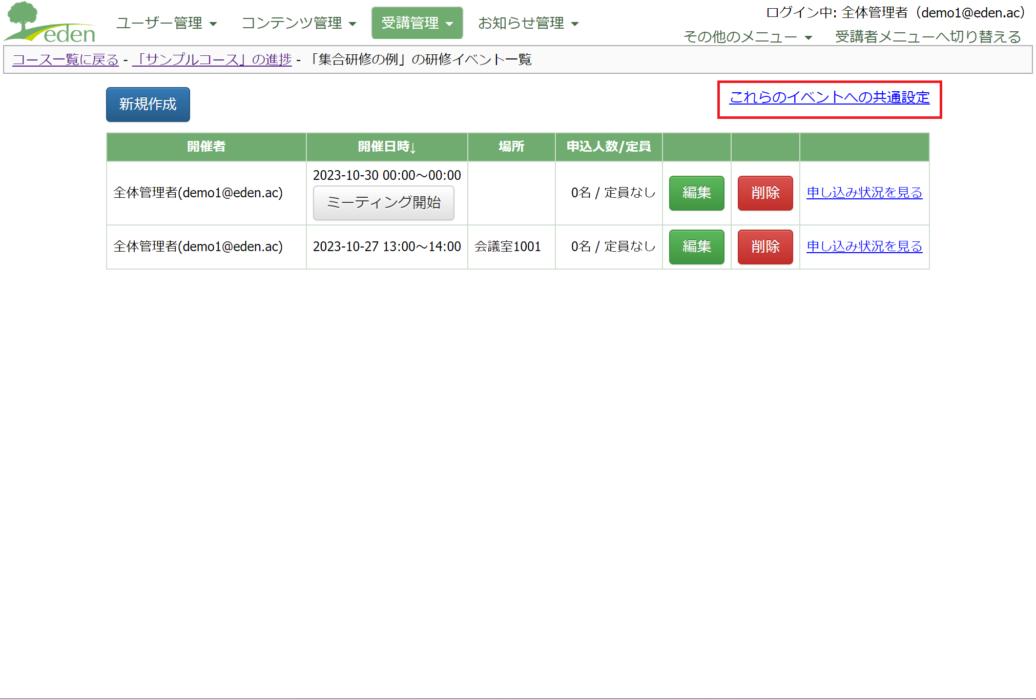 ここでは、対面研修セクションで研修イベントを作成し、受講者の参加募集を行う際に、複数のイベントに重複参加ができないようにする方法について説明します。集合研修で受講者の参加募集を行なう方法については「集合研修で受講者の参加募集を行なう方法」をご覧ください。