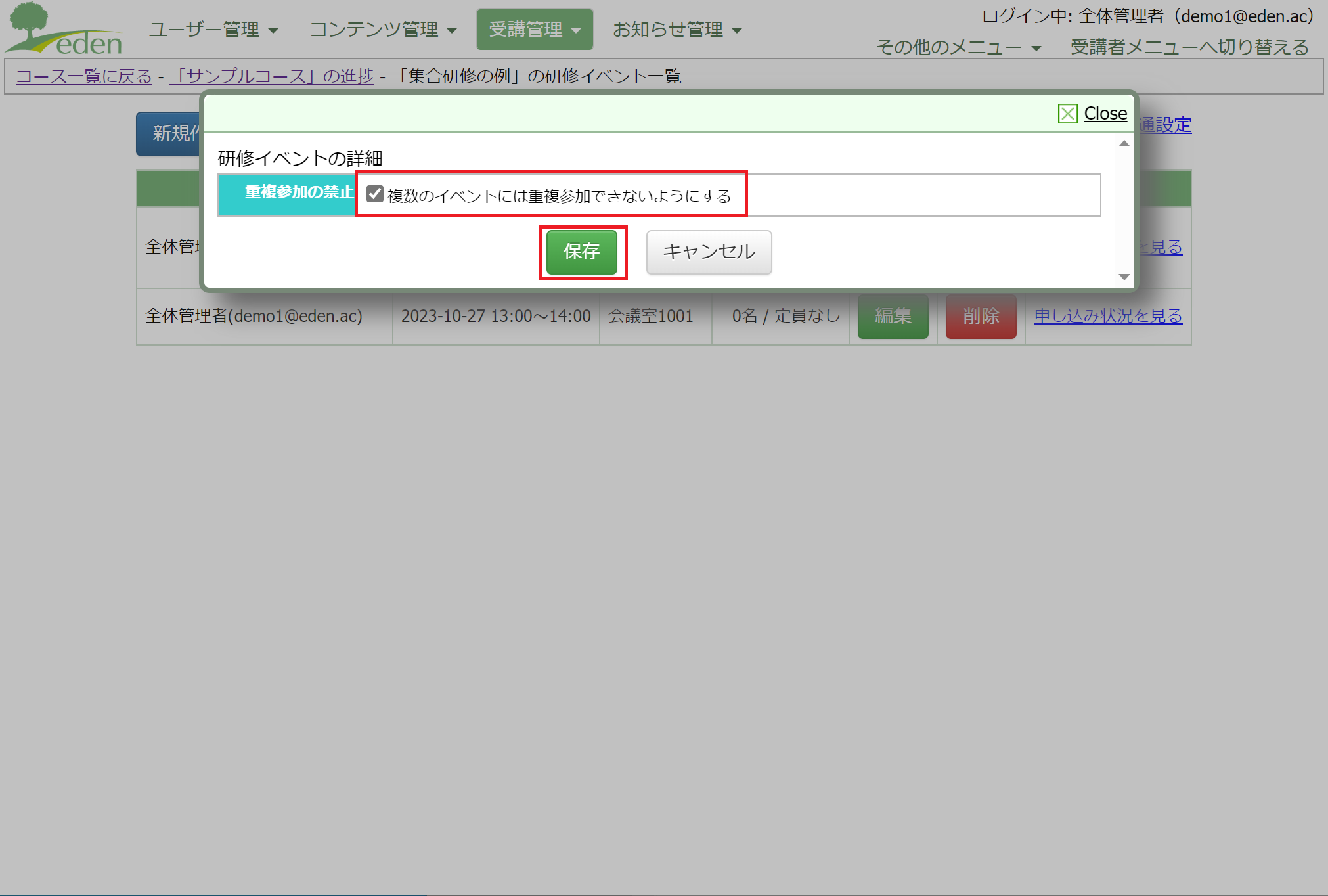 「複数のイベントには重複参加できないようにする」にチェックを入れ、「保存」をクリックします。