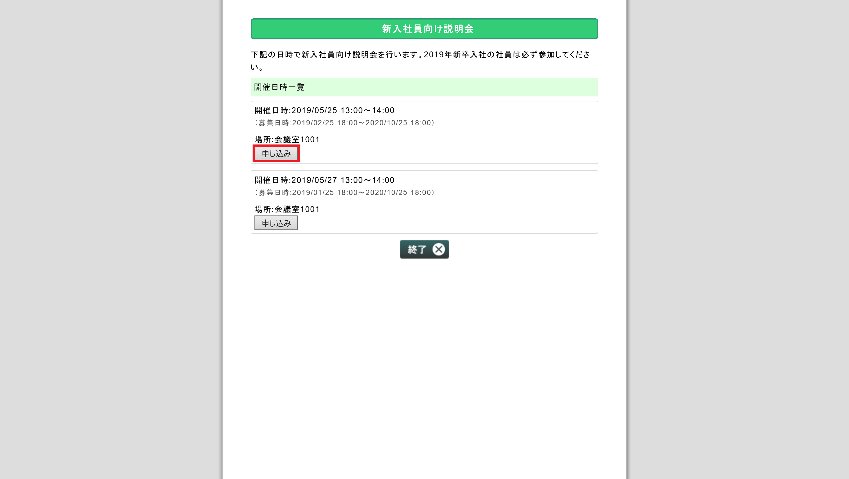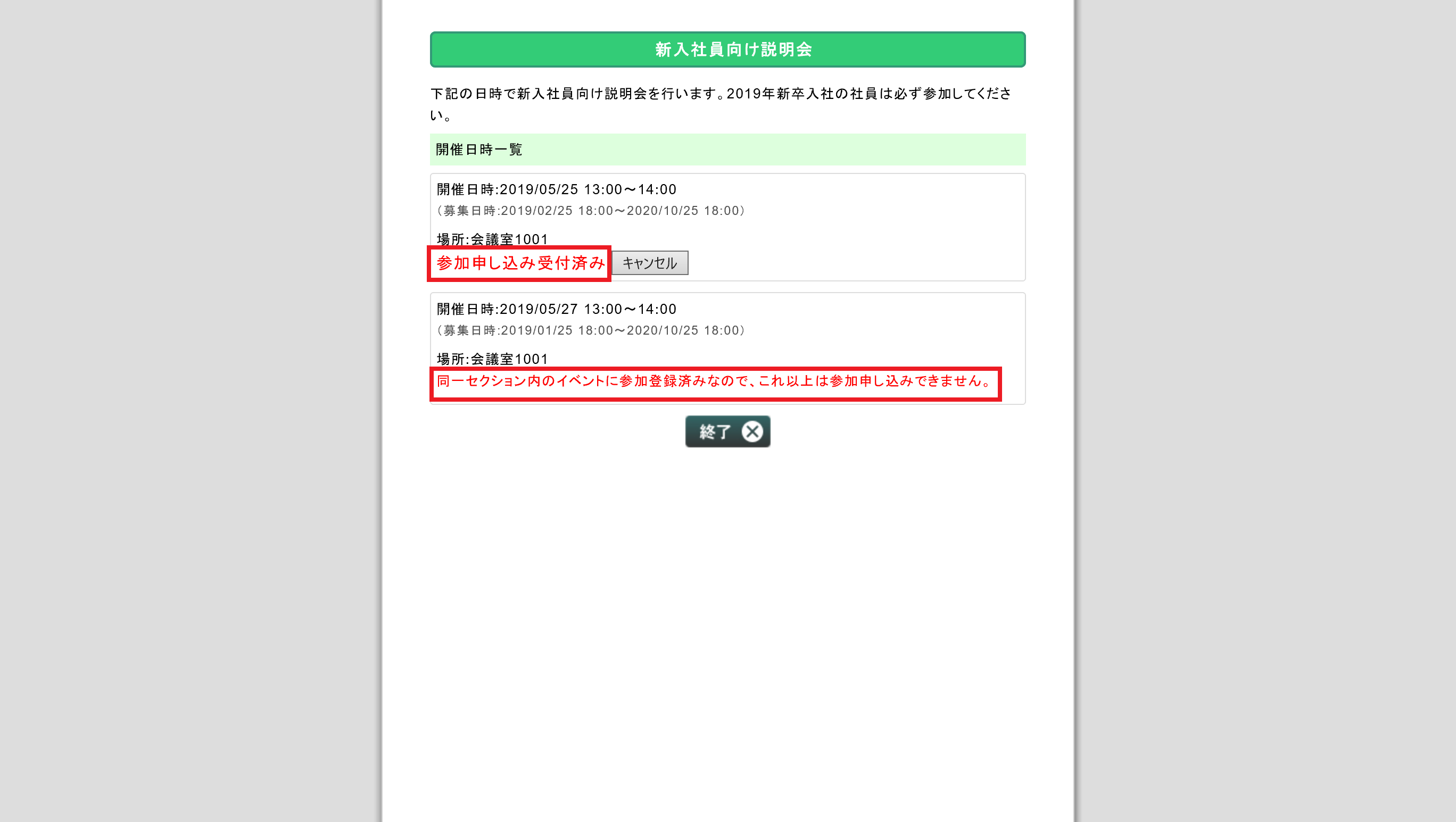 受講者が設定した研修イベントに申し込みを行うと、他の研修イベント欄に重複参加の申し込みが出来ない旨のメッセージが表示されます。