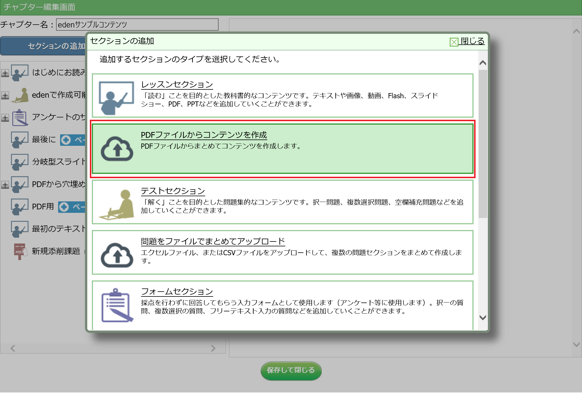 一覧から、「PDFファイルからコンテンツを作成」をクリックします。