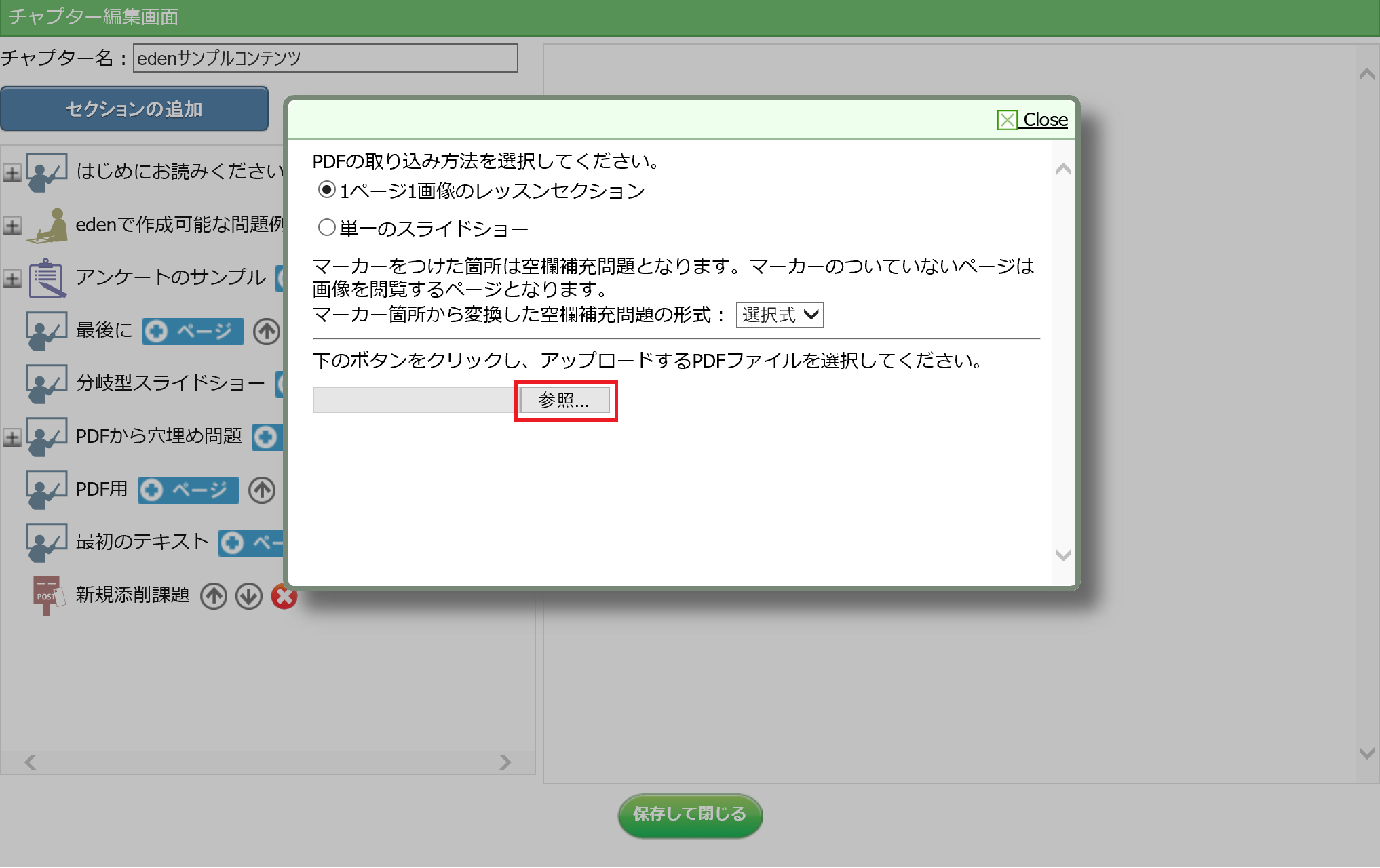 STEP3: 「参照」ボタンでアップロードするPDFファイルを指定する