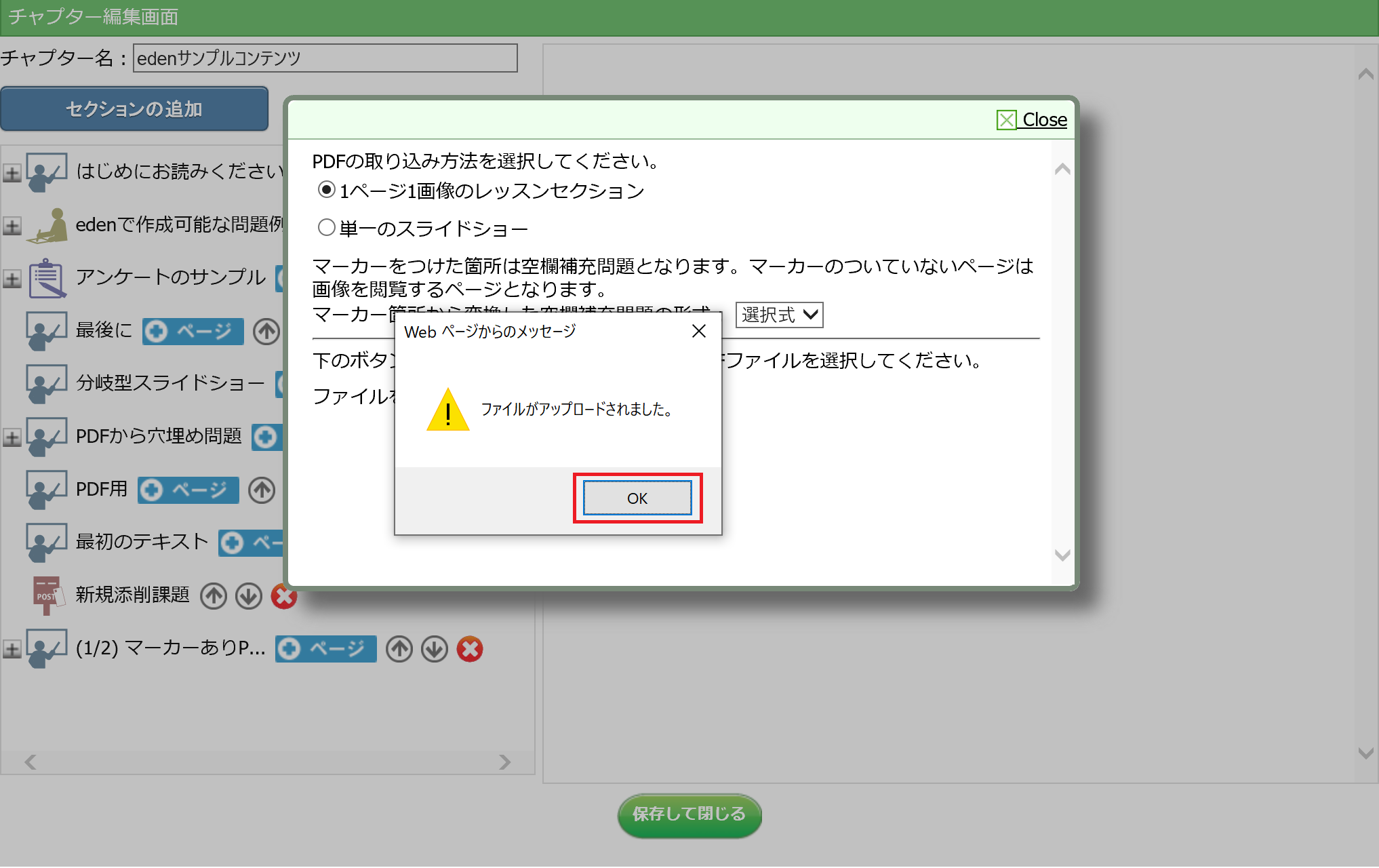 「ファイルがアップロードされました。」というメッセージが出たら、「OK」ボタンをクリックします。