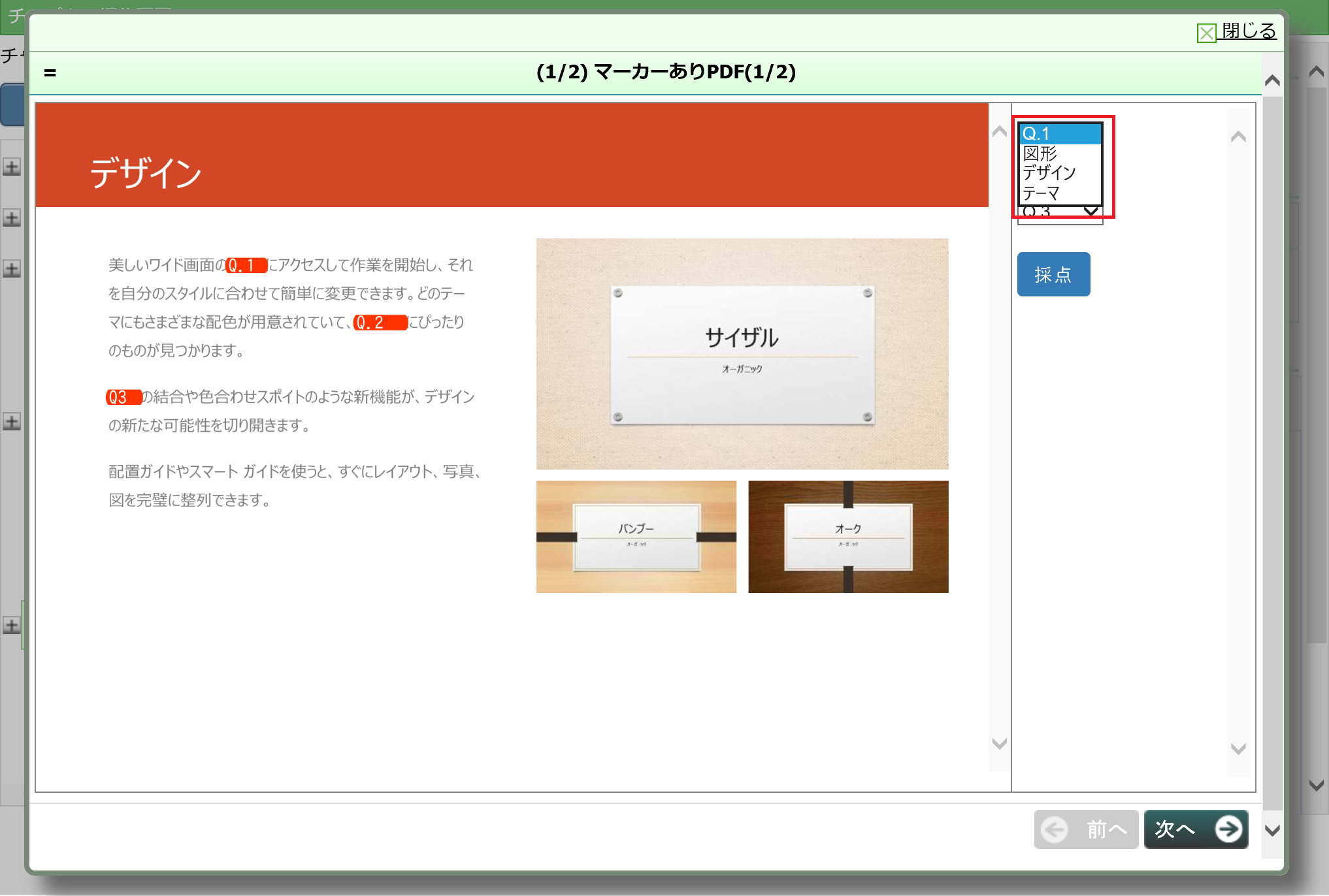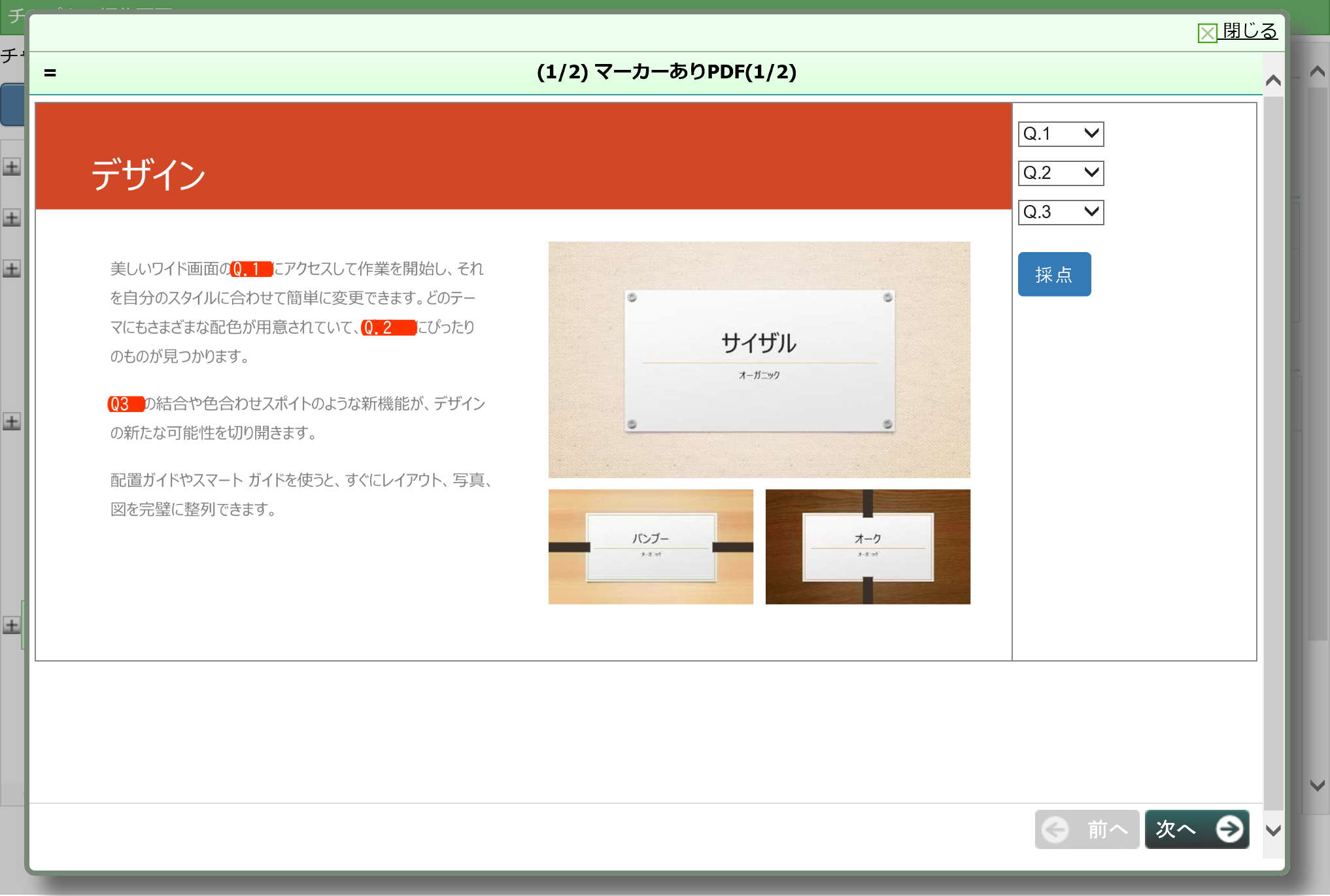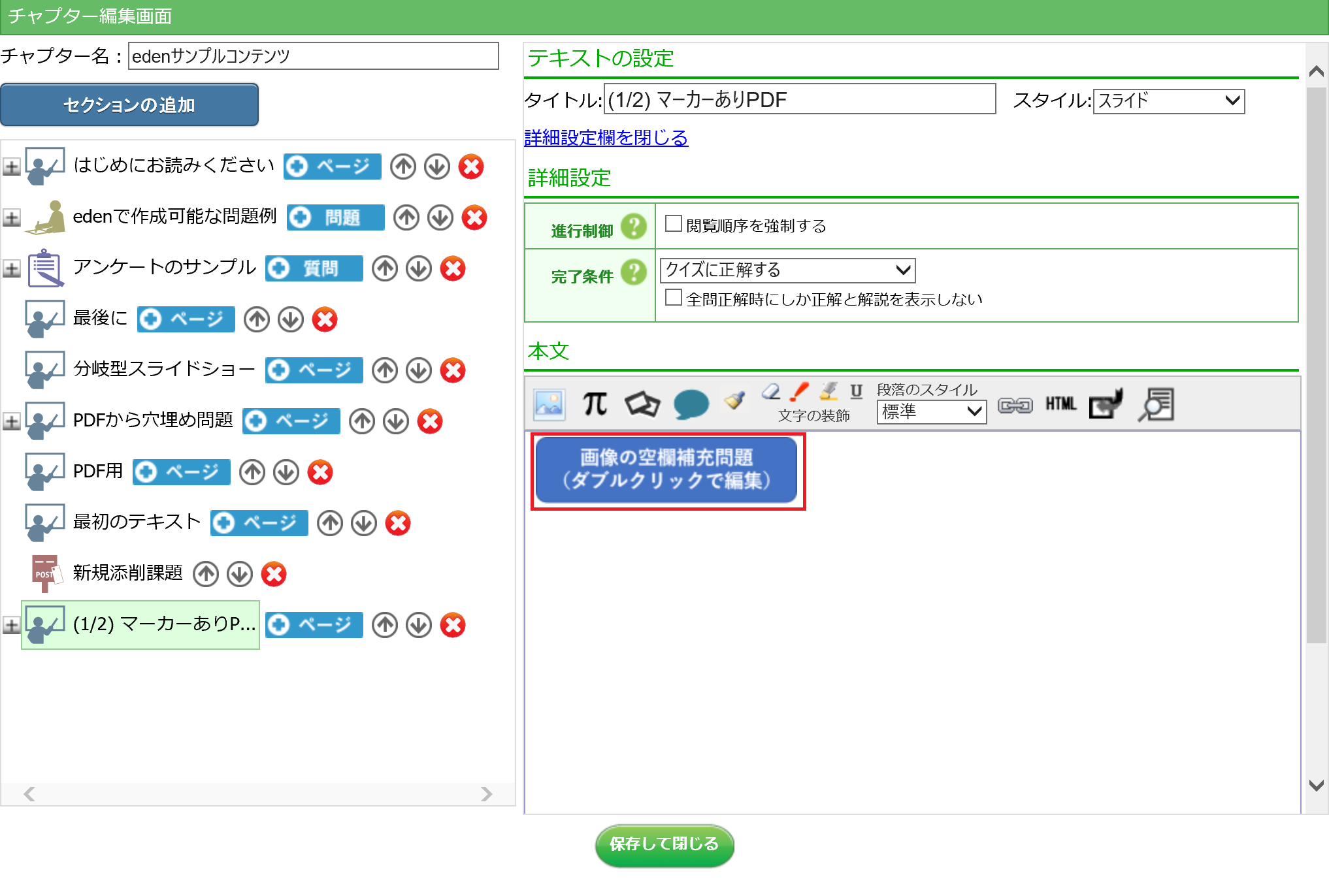 eラーニングシステム「eden LMS」では、あらかじめマーカーを付けておいたPDFファイルをアップロードするだけで、空欄補充問題のページをかんたんに作成することができます。