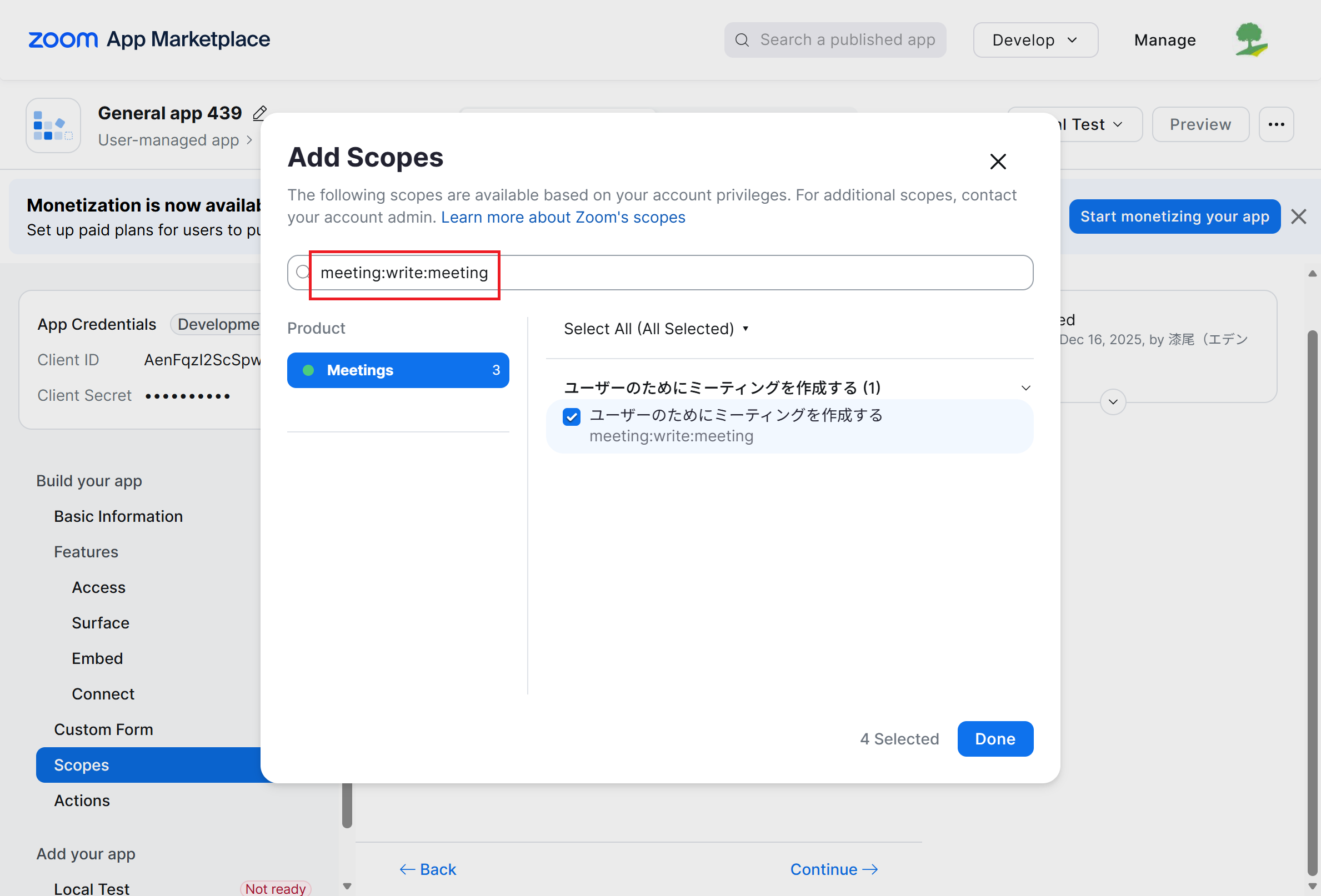 edenと連携してZoomウェビナーも開催する場合は、下記の4つの権限も追加してください。