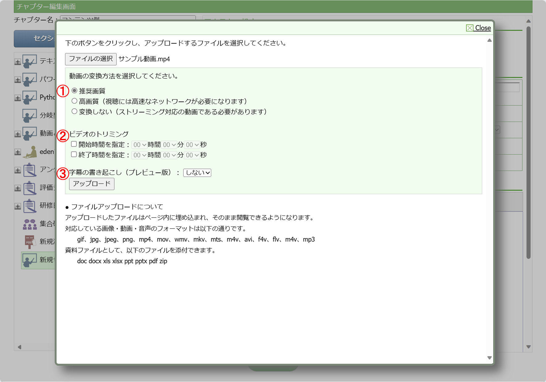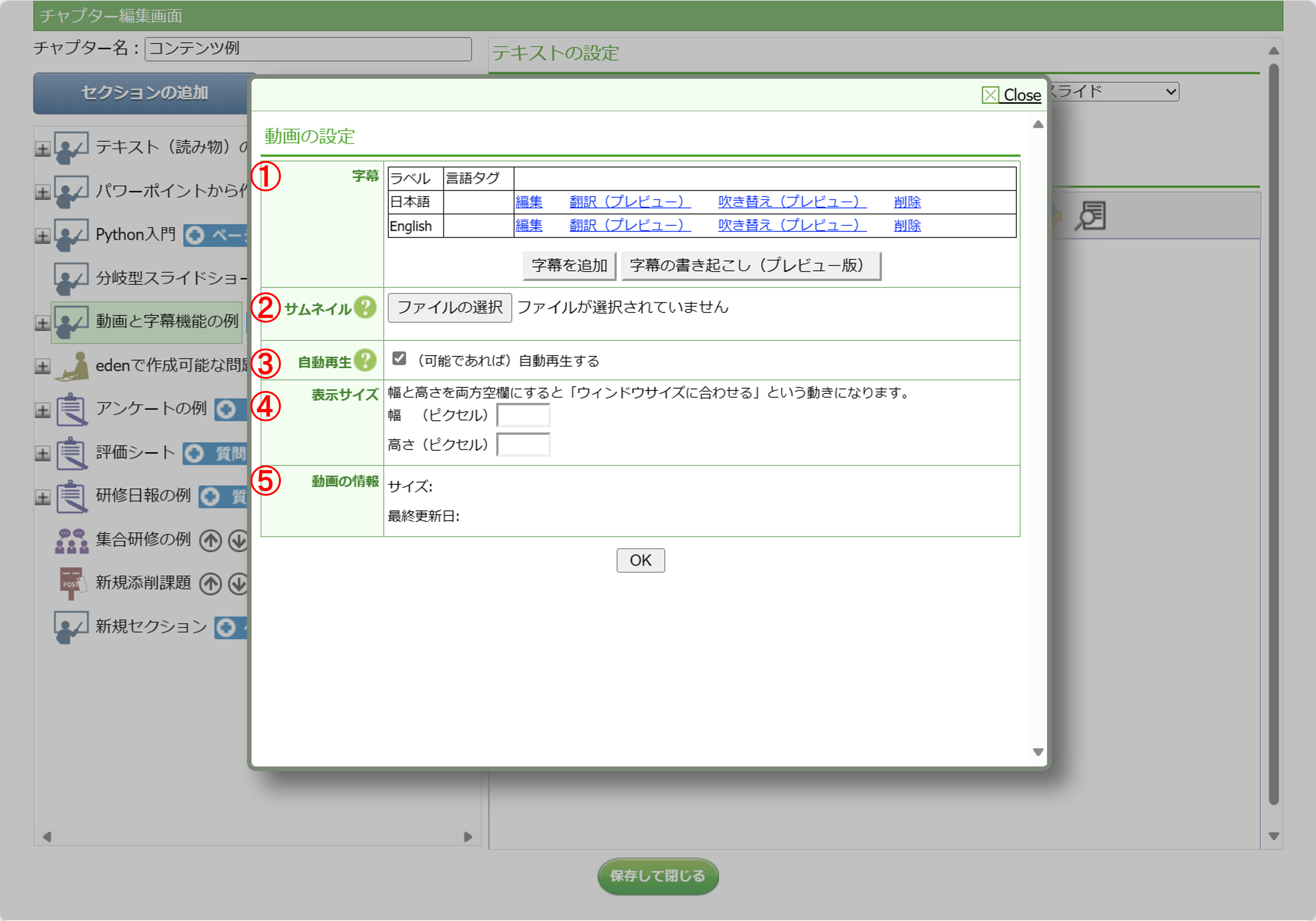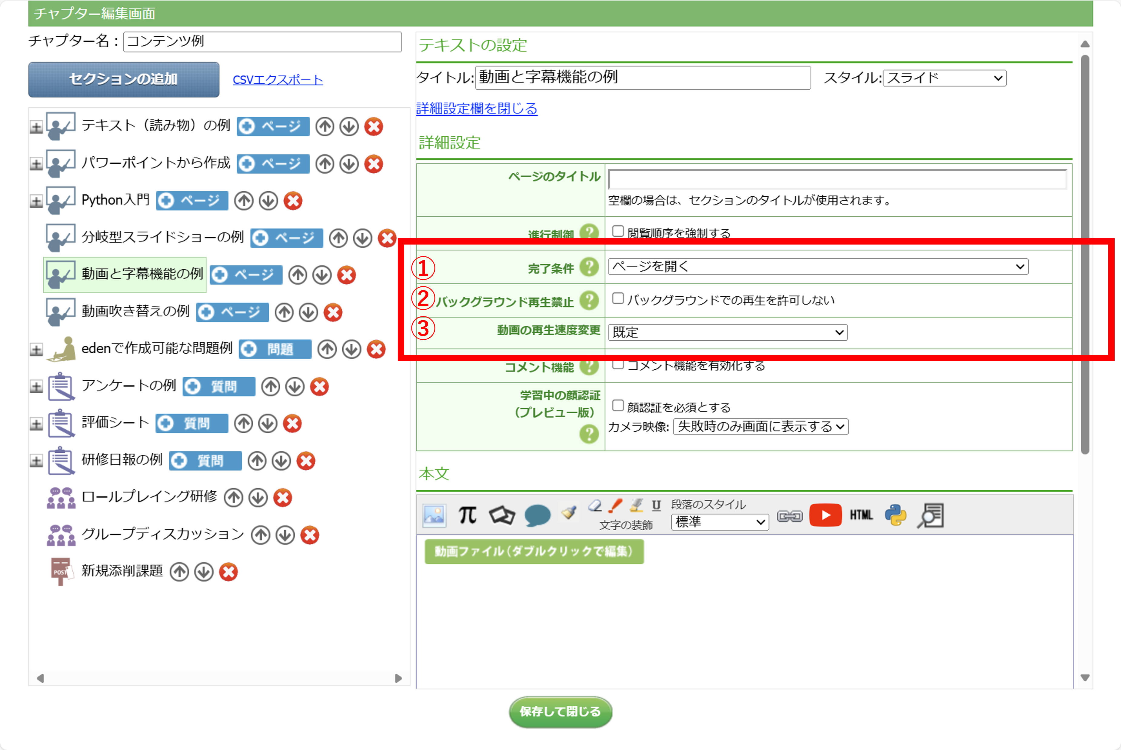 動画を作成した後、動画ファイルごとに見やすくするための各種設定をしたり、レッスンセクションで視聴に関する挙動などの設定をしたりできるようになっています。