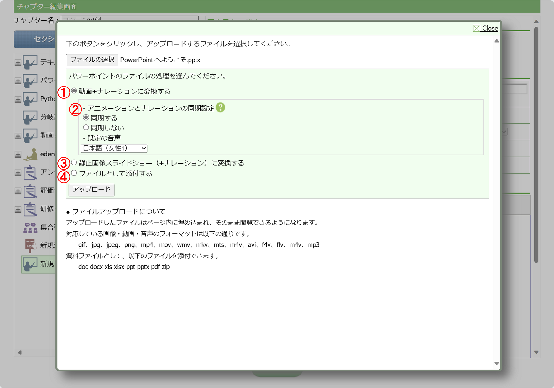 ここでは、パワーポイントファイルをedenにアップロードする際の設定について説明します。操作の具体的な手順についてはパワーポイントからアニメーションとナレーションを含んだ動画を作成するの「手順2. パワーポイントのファイルをedenにアップロードする」をご覧ください。